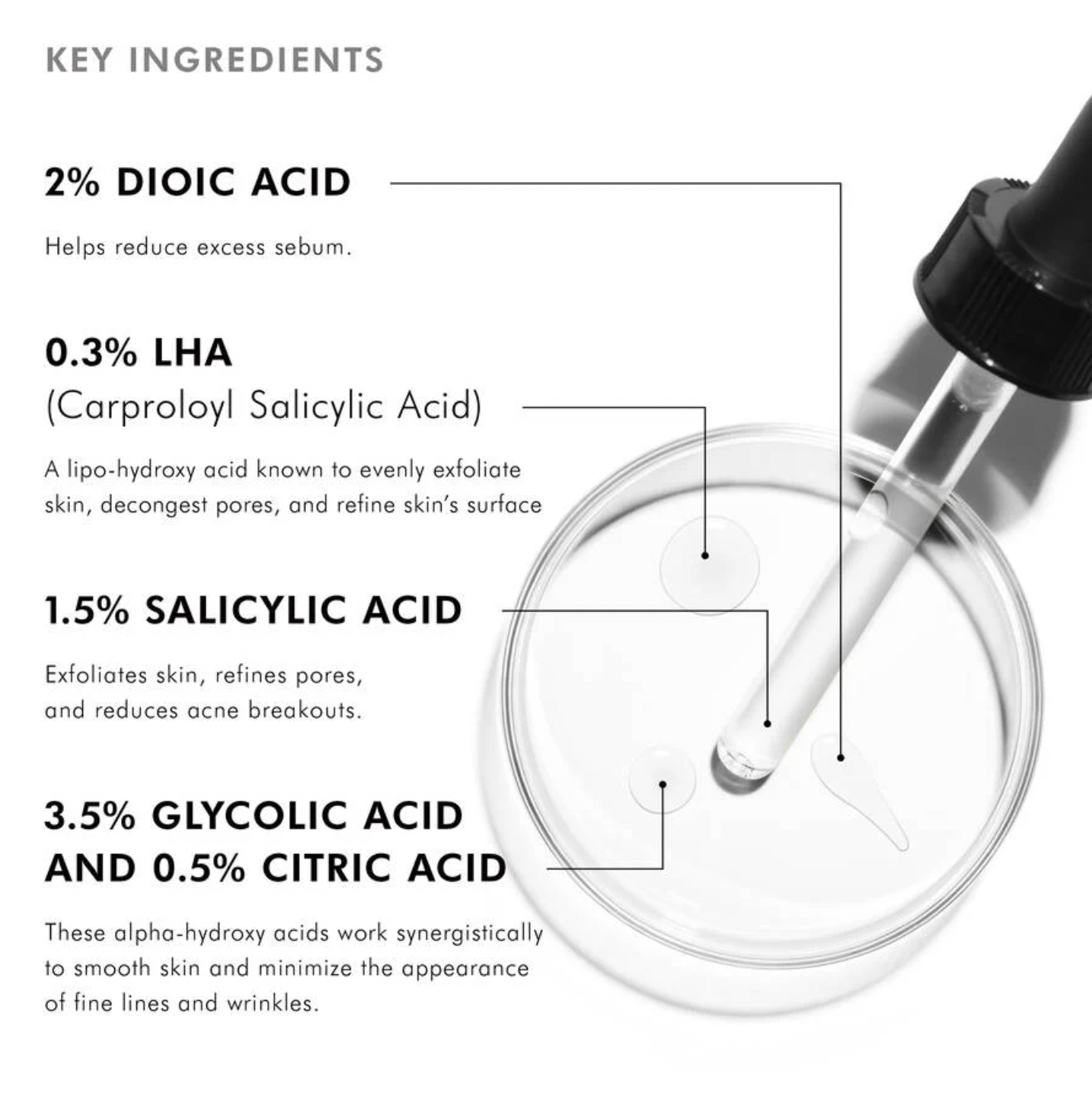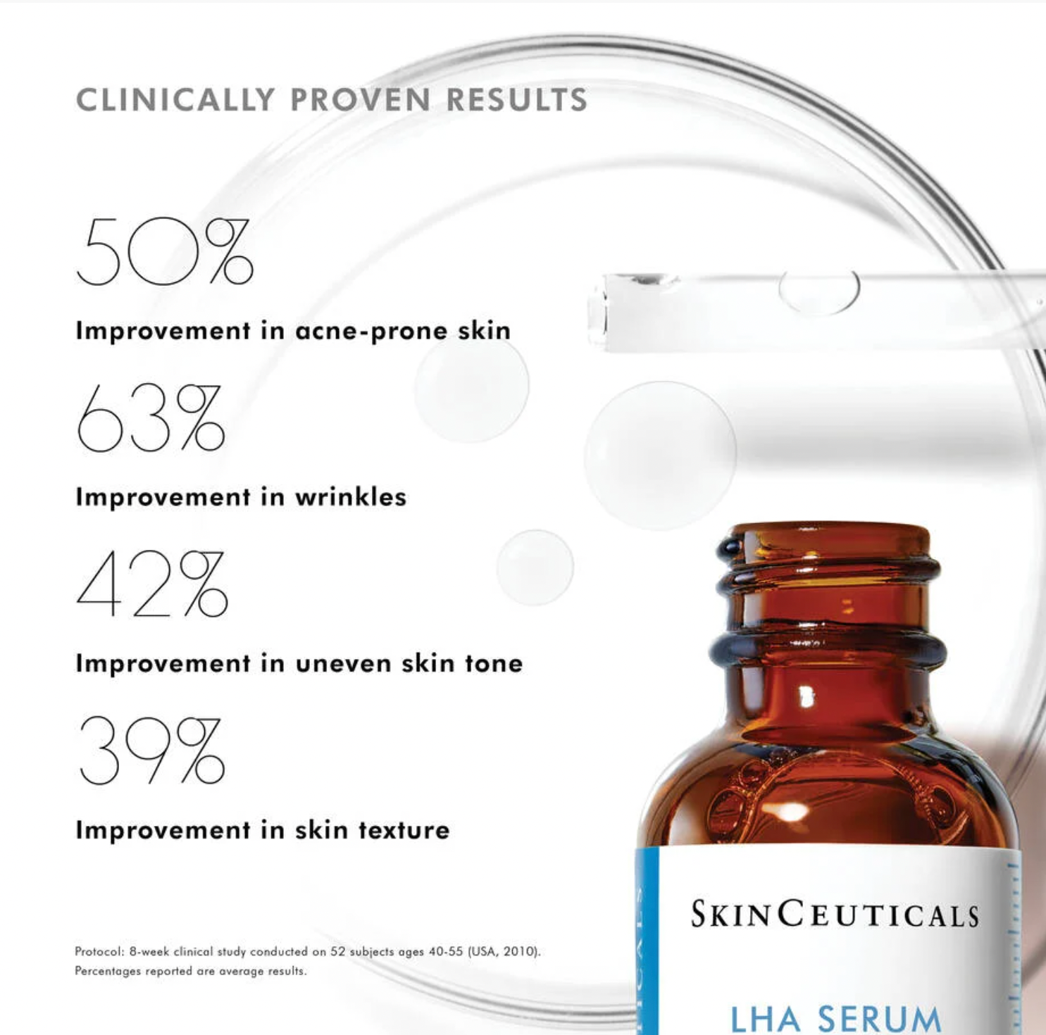 LHA Serum is an oil-free, targeted serum for aging & acne-prone skin. This first-to-market acid blend uniquely combines LHA, salicylic acid, glycolic acid and dioic acid to reduce excess sebum production, prevent clogged pores, improve the look of acne-prone skin, wrinkles, uneven skin tone, and texture.