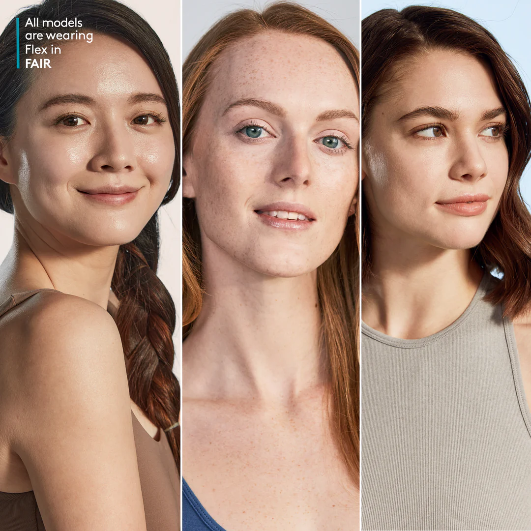 FLEX features innovative, iron oxide pigments that bloom in your fingertips to deliver tone-adapting buildable color coverage with a demi-matte finish.